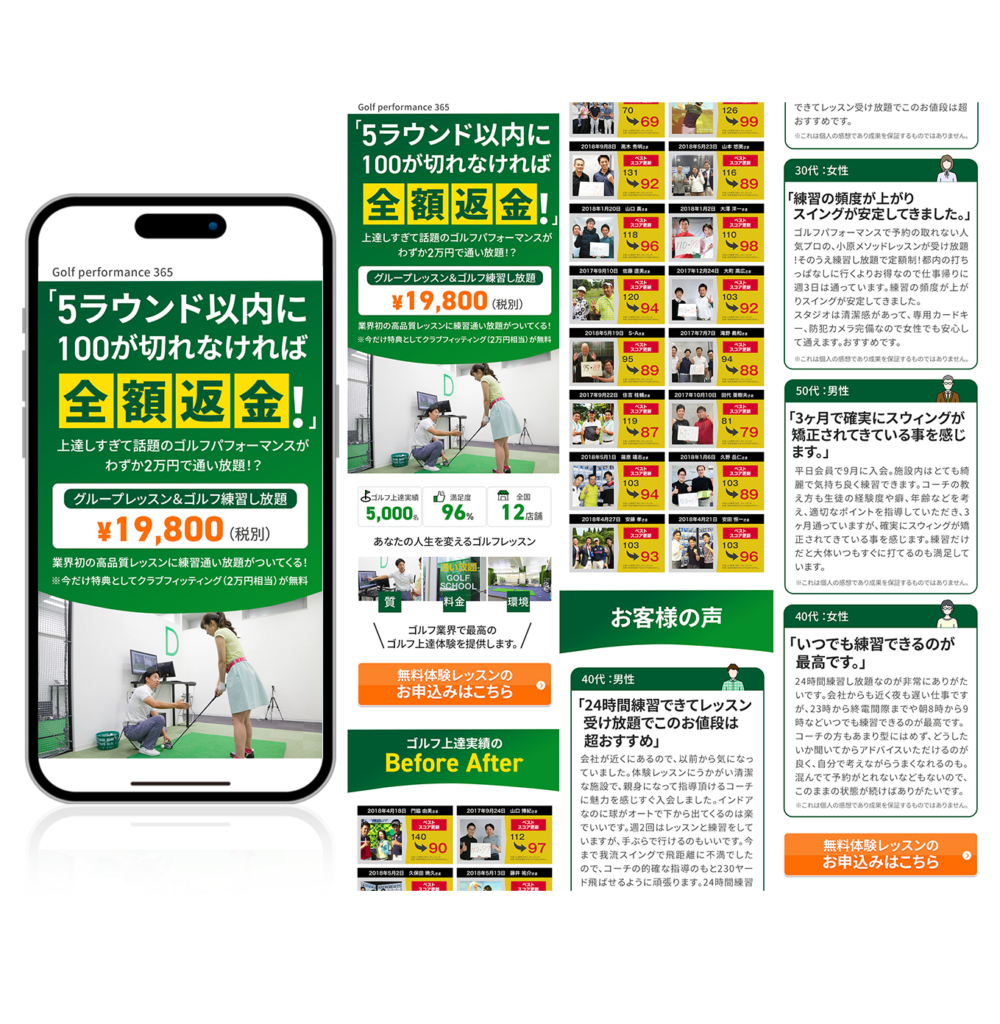 ゴルフスクールLP 2025年11月26日 最終更新日時 : 2025年12月27日 ToaT design サイズ:幅750px(スマートフォン用)ゴルフスクールの無料体験レッスン申込みを目的としたLP。ターゲットは50代~60代男性ゴルファー。ゴルフコースをイメージさせる緑を基調に、「全額返金」「Before After」などに黄色のアクセントを入れて目立たせました。スクールのリアルな雰囲気を伝えるため、コーチの熱心な指導の写真を起用しています。 \ 最新情報をチェック /